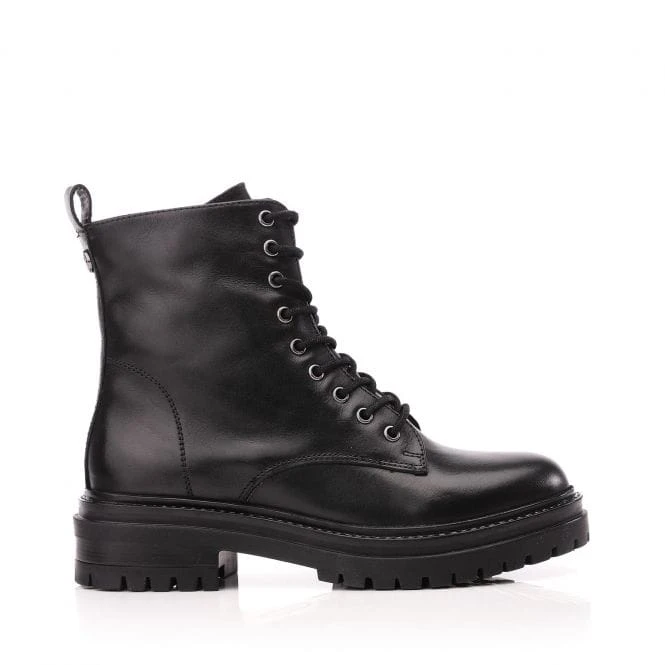Add Camola to your boot collection. The classic black leather finish makes this boot perfect for pairing with a wide range of outfits, whilst the chunky sole will add subtle lift. Complete with classic lace up finish, this ankle boot will serve you on many occasions. The faux fur lining and leather sock make for a cosy wear.