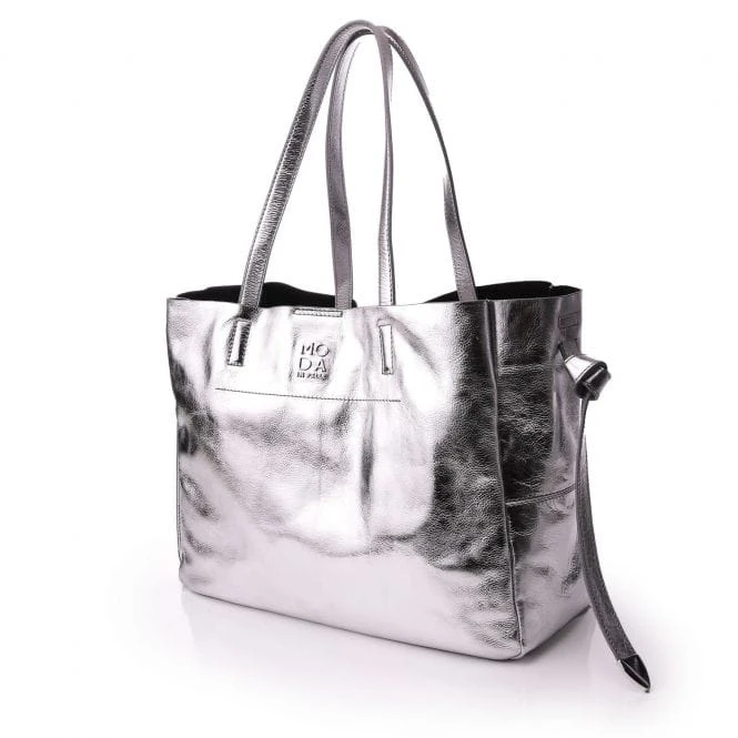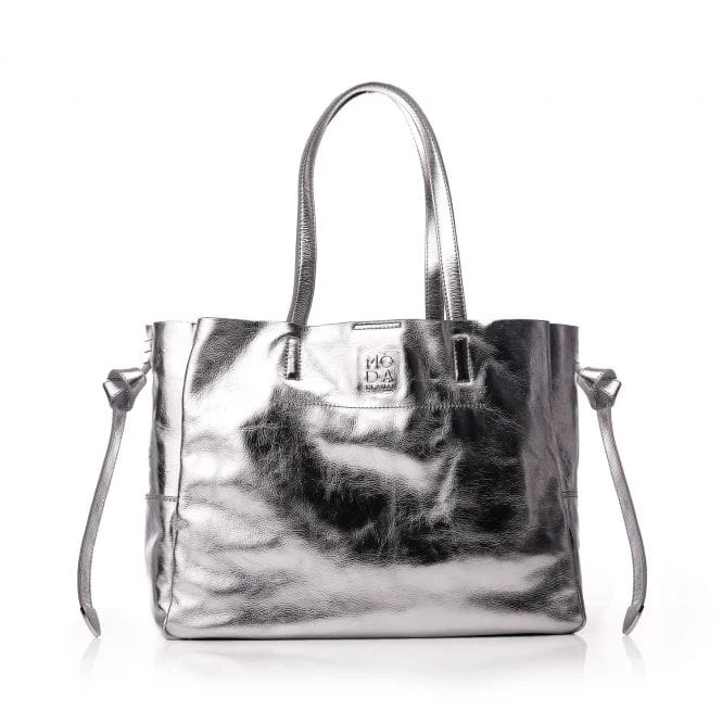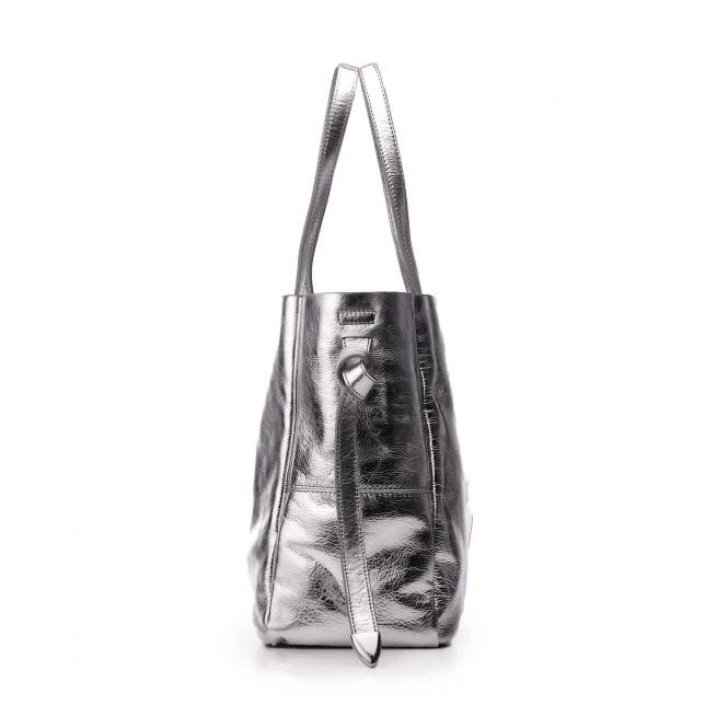 The season’s must-have tote. Indiie bag has a beautiful silver metallic leather finish, perfect for all year round – the ultimate investment. Wear the double straps over the shoulder, or on the arm. Complete with press stud fastening, keeping your essentials safe whilst the base stud feet protect the bottom of the bag. The side tie detail finishes this bag off beautifully, whilst the unlined nature allows for a natural finish.