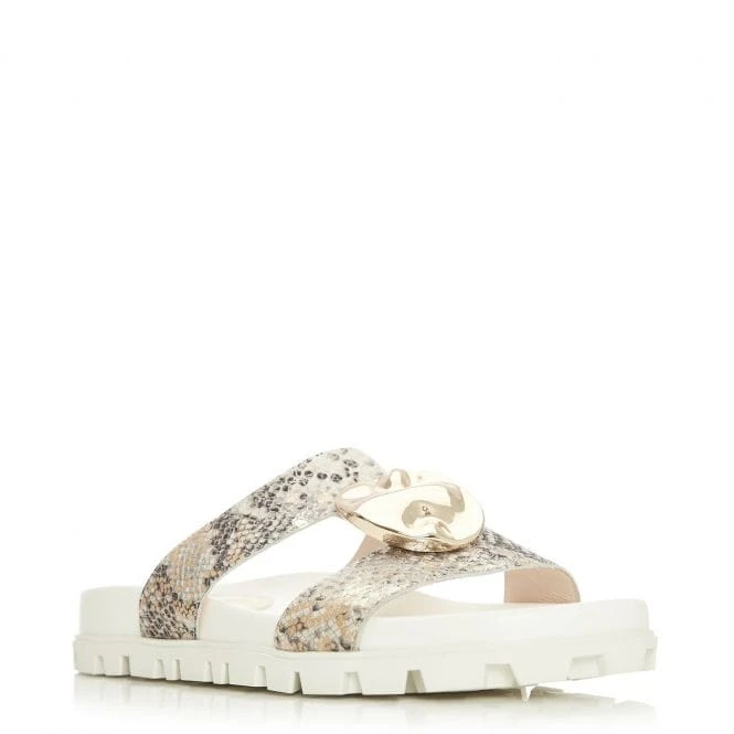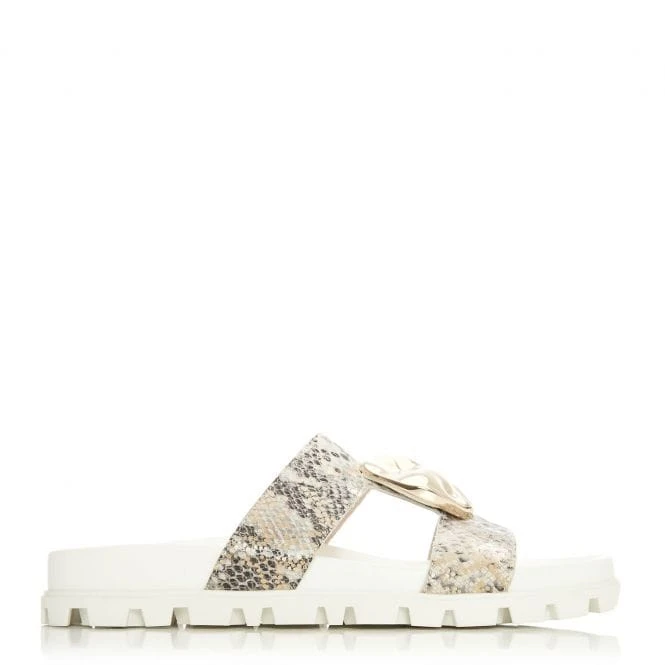 Get to know Nattie, our gorgeous chunky slider in metallic snakeskin print. The double straps keep your foot securely in place, whilst the hammered disc adds detail – catching the light and drawing more attention to this stunning shoe. The cleated sole provides extra grip whilst keeping you looking stylish. Perfect to pair with denim.